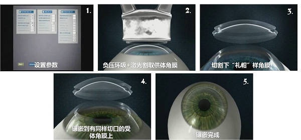 飛秒激光先設計好參數,設定切割角膜的深度、寬度、形狀。(圖1)利用負壓環吸壓在角膜上(圖2),根據參數激光可以切割出我們設定的形狀,如“禮帽”樣的形狀(圖3)。供體角膜與受體角膜按相同參數切割,再把供體切割下來的角膜鑲嵌到受體角膜的切口上(圖4),對合的非常好(圖5)。因為切割面平滑且鑲嵌得非常整齊,術后散光就小了。